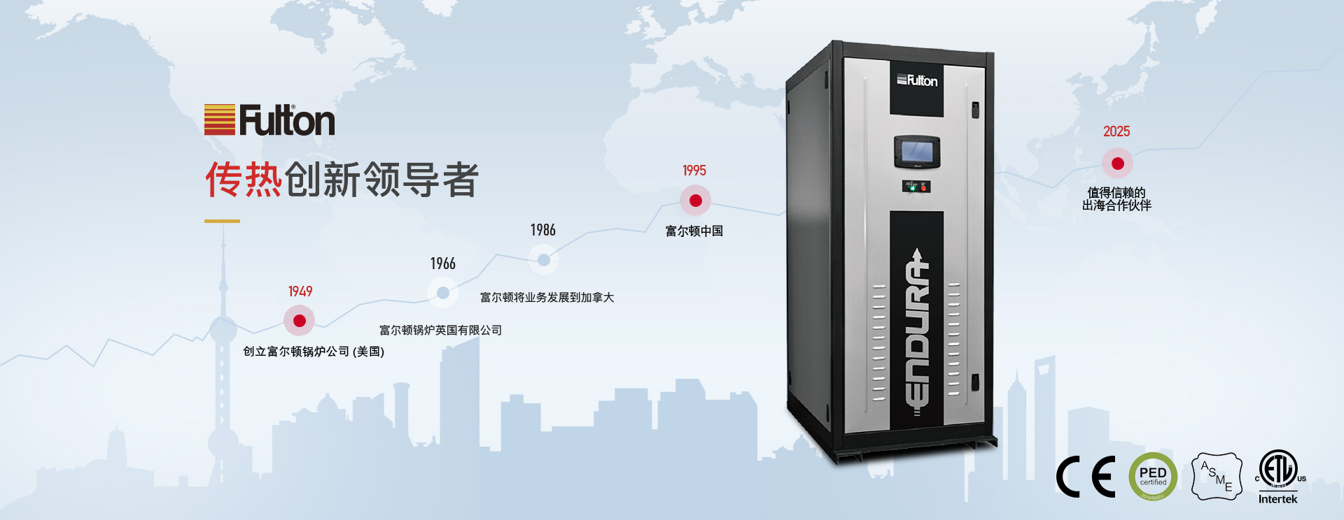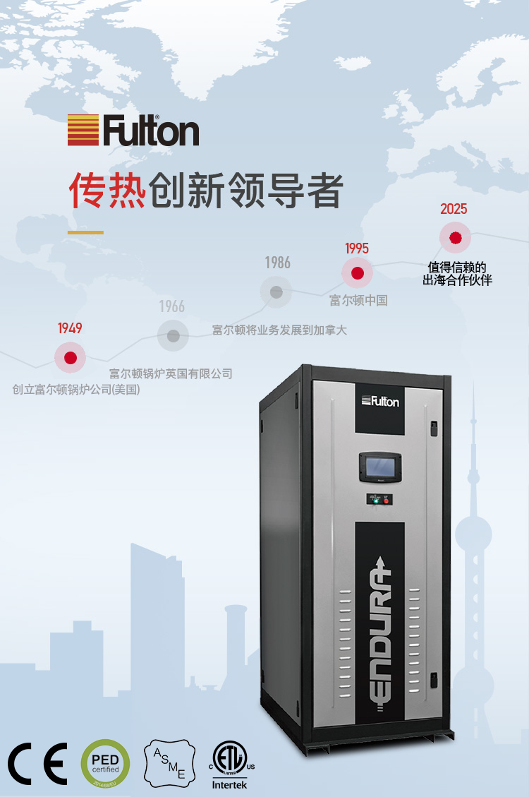 富爾頓是國際著名的跨國高質(zhì)量傳熱產(chǎn)品制造商,具有七十多年的專業(yè)設計、制造、銷售鍋爐的經(jīng)驗,是立式無管鍋爐和脈沖燃燒鍋爐的發(fā)明者,幾十年來一直領導世界鍋爐新潮流。